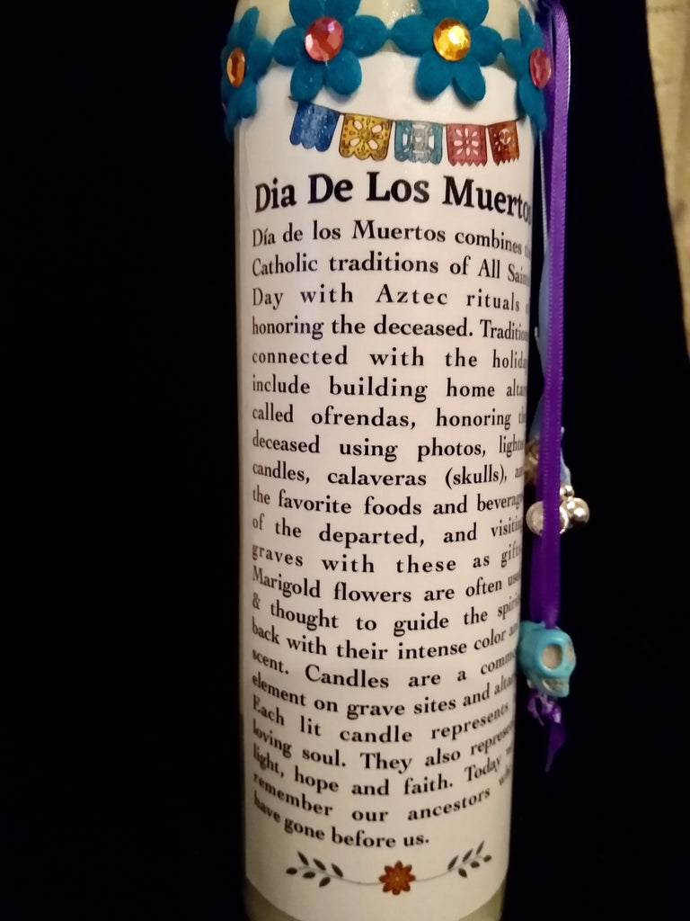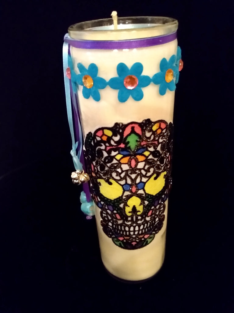 Dia de los Muertos Altar Candle. Hand poured 100% soy natural unscented wax. Hand decorated with sugar skull motif (front), adorned with ribbons, beads, rhinestones. Description of the Dia de los Muertos celebration ( on back). Perfect addition for altars, and any celebration.